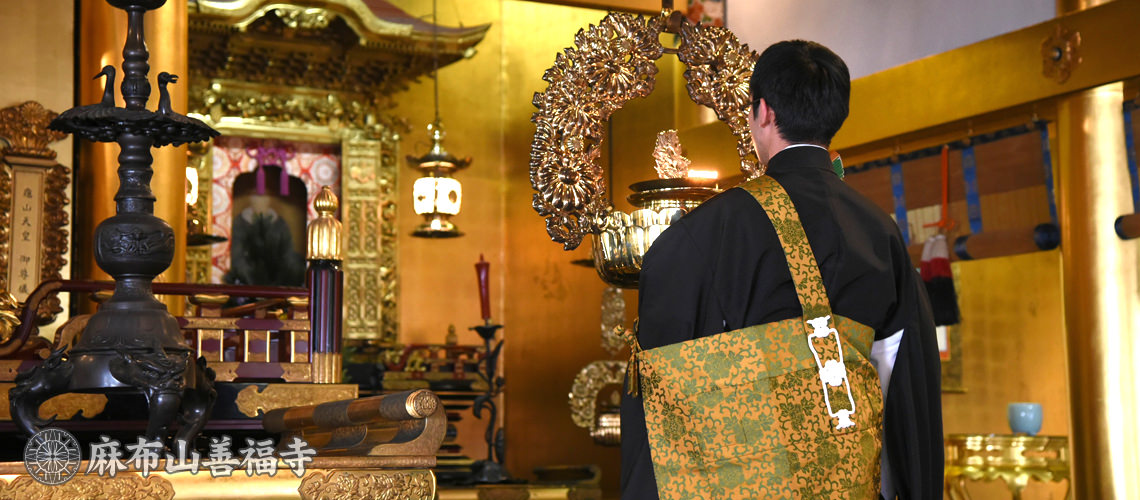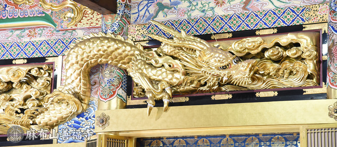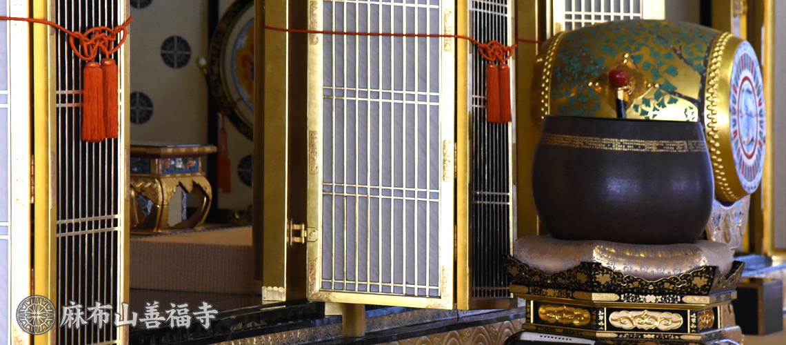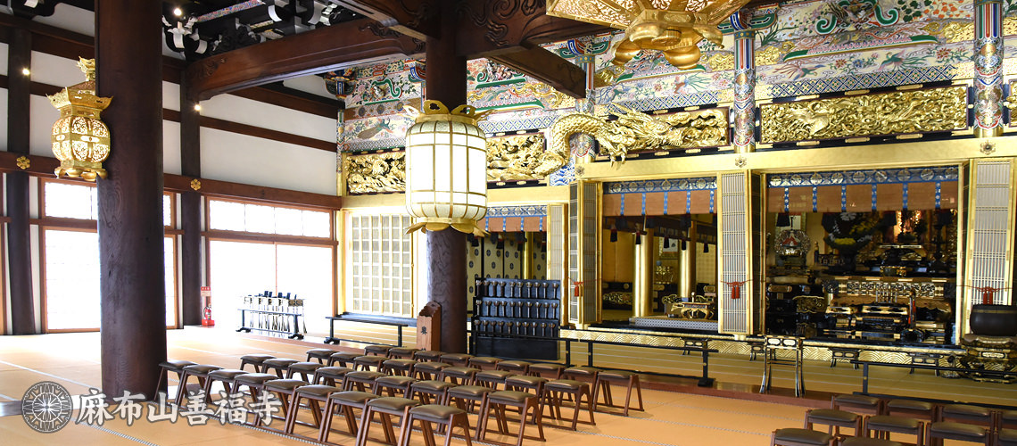 本堂 現在の本堂は、慶長12年(1607年)に徳川家康が東本願寺八尾別院本堂として建立し、京都天明の大火の後10年間御影堂の役を勤めた建物を昭和36年(1961年)に移築、再建した由緒あるものです。 当山の本堂は昭和36(1961)年に移築以来、大きな修復が行われておらず屋根瓦の損傷、雨漏り等に伴う老朽化が顕在化しため、先人の業績を後世にとどめると共に、宗祖のみ教えを永く後の世に伝えるため、建具や彫刻物等、創建当時の大変貴重なものを守る修復工事を平成20(2008)年に行いました。