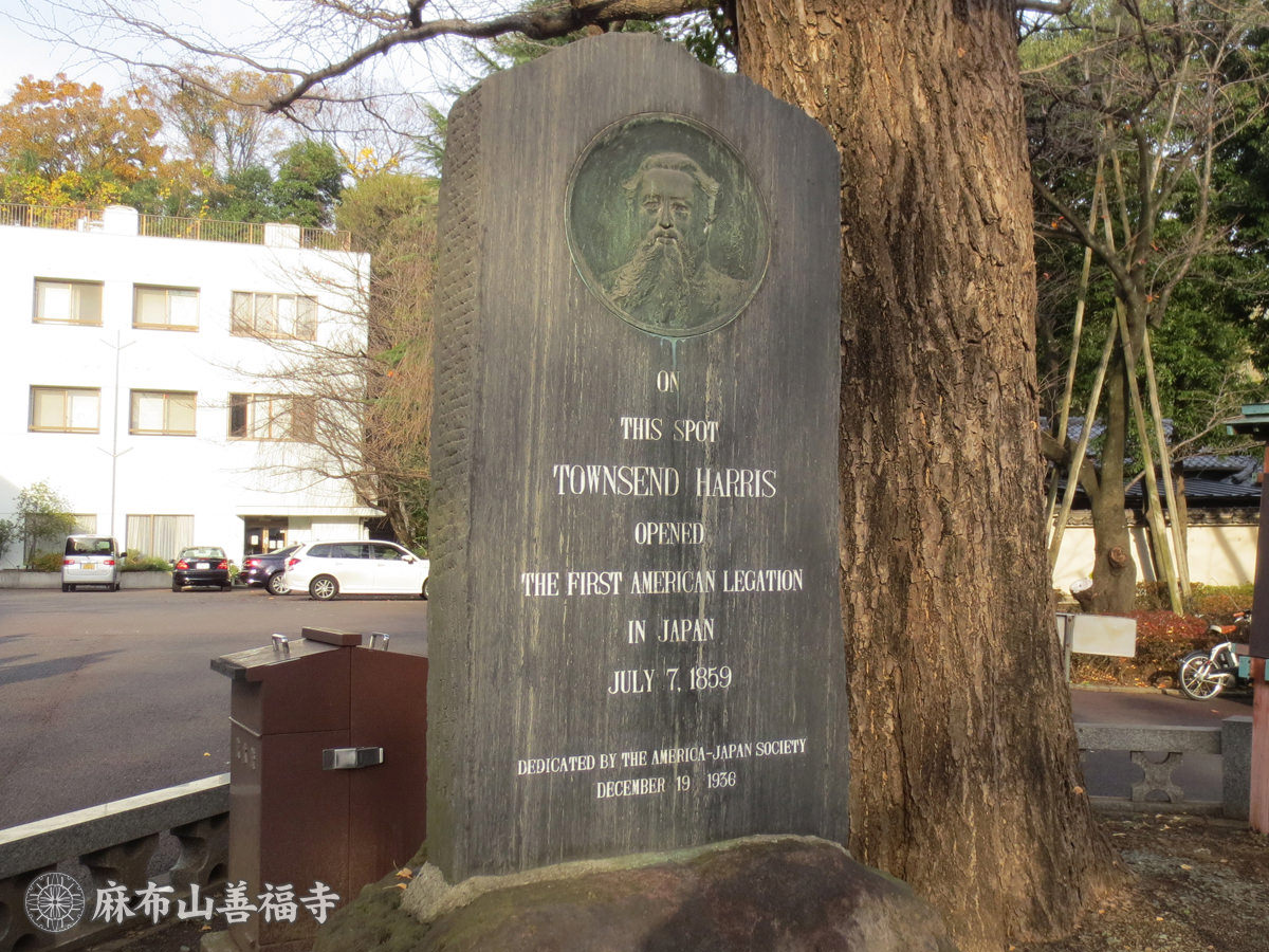 駐日公使タウンゼント・ハリスのもと、安政6年(1859年)から明治8年(1875年)まで、初代アメリカ合衆国公使館であったことを記念する碑。