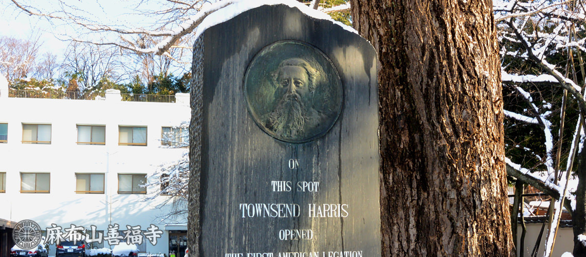 アメリカ公使館記念碑 幕末の安政6年(1859年)、麻布山善福寺は、初代アメリカ公使館としてタウンゼント・ハリス公使以下館員を迎えました。 その頃、譲夷を唱える人々の襲撃をうけ、庫裡・書院などが焼失しましたが、僧たちの機転により身をもって公使館員を守リ、日米友好の紳を深めました。
