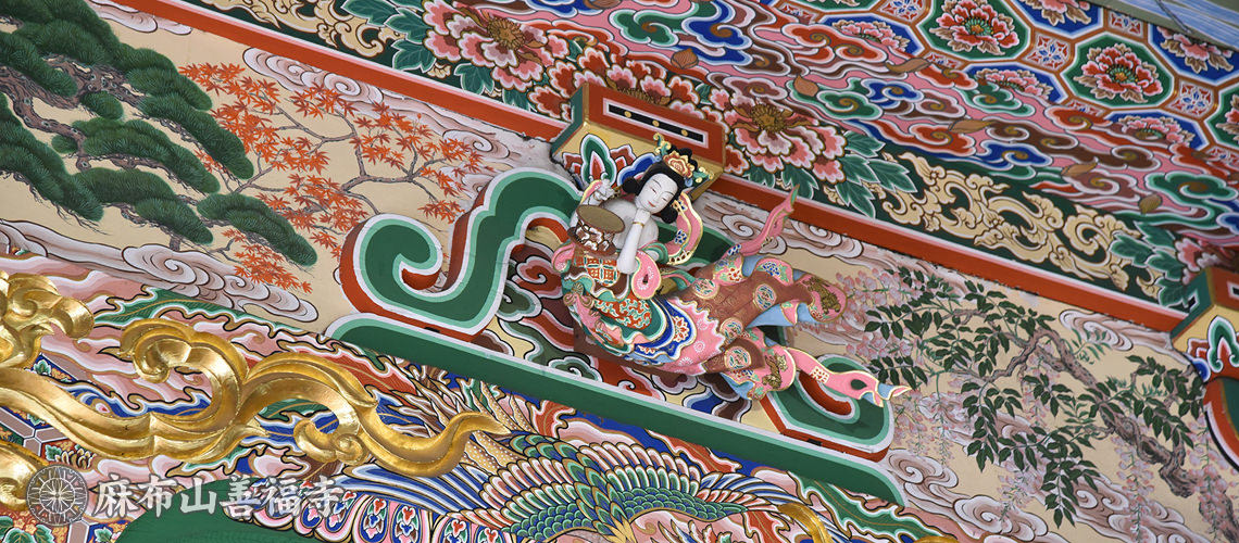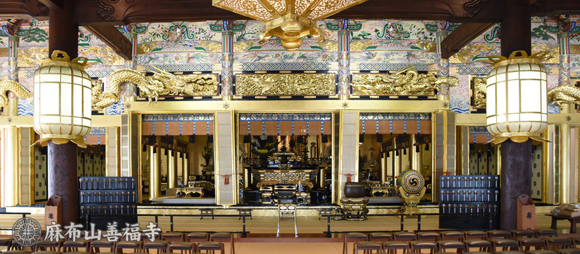 本堂 現在の本堂は、慶長12年(1607年)に徳川家康が東本願寺八尾別院本堂として建立し、京都天明の大火の後10年間御影堂の役を勤めた建物を昭和36年(1961年)に移築、再建した由緒あるものです。 当山の本堂は昭和36(1961)年に移築以来、大きな修復が行われておらず屋根瓦の損傷、雨漏り等に伴う老朽化が顕在化しため、先人の業績を後世にとどめると共に、宗祖のみ教えを永く後の世に伝えるため、建具や彫刻物等、創建当時の大変貴重なものを守る修復工事を平成20(2008)年に行いました。
