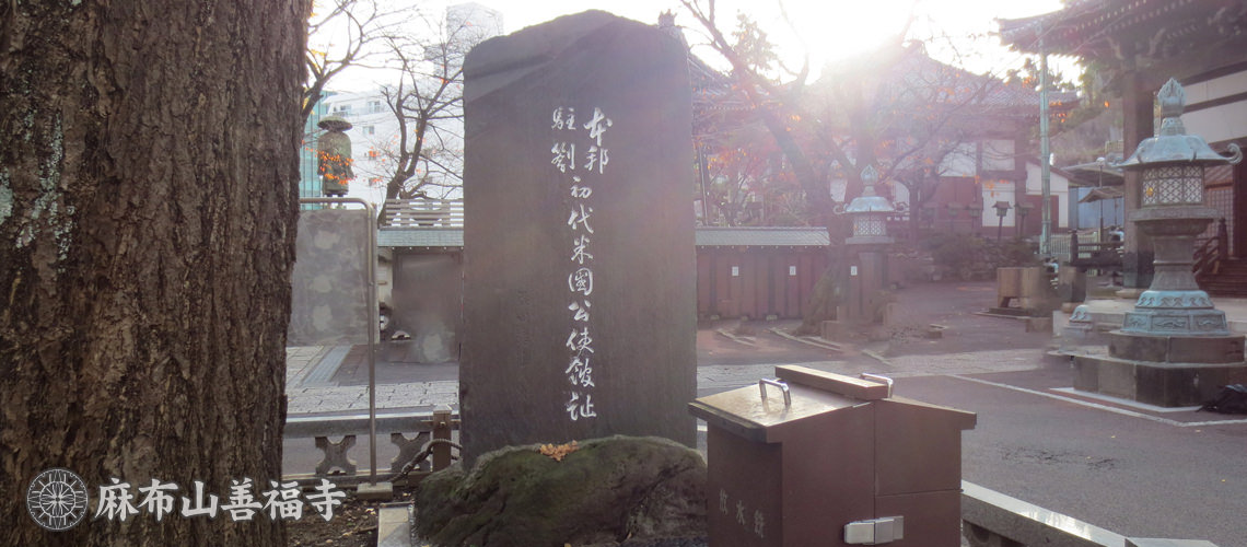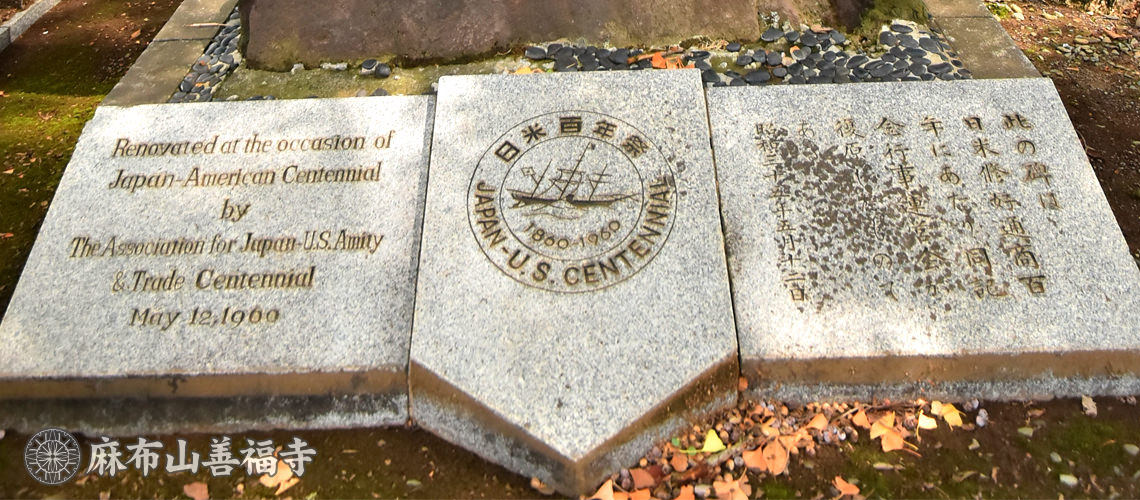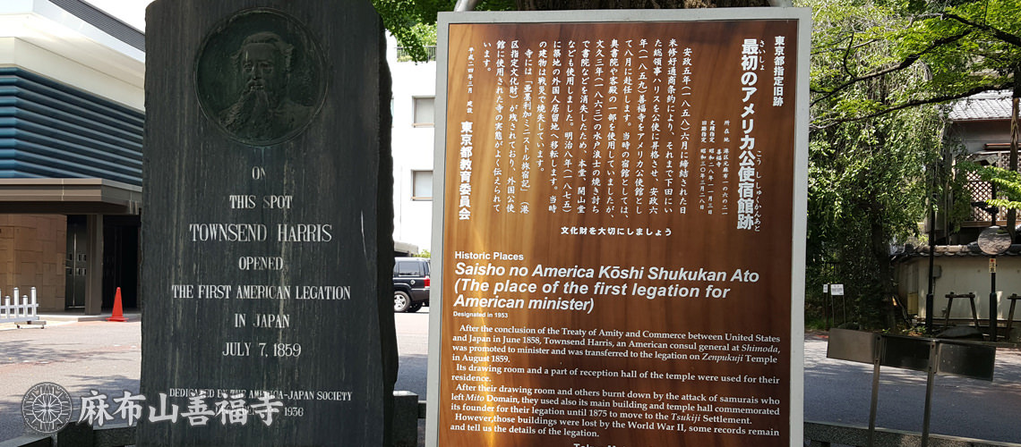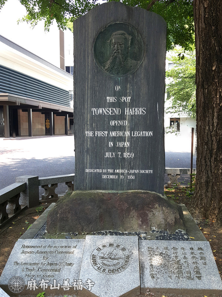 アメリカ公使館記念碑 幕末の安政6年(1859年)、麻布山善福寺は、初代アメリカ公使館としてタウンゼント・ハリス公使以下館員を迎えました。 その頃、譲夷を唱える人々の襲撃をうけ、庫裡・書院などが焼失しましたが、僧たちの機転により身をもって公使館員を守リ、日米友好の紳を深めました。